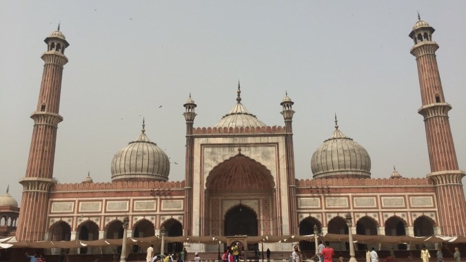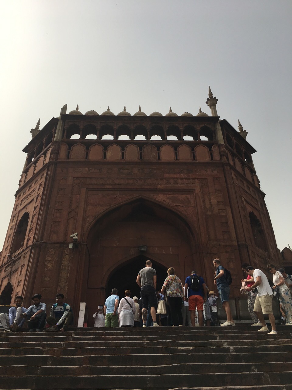 Travelling by bike.Our first stop was Jama Masjid in Chandni Chowk. It was built by Shah Jahan in 1656 and can accommodate 25 000 people. The masjid is absolutely beautiful. It is made of red sandstone and white marble. The marble reminds me of the haram in Makkah, it’s smoothness and cold, it’s a source of relief on a hot summer day in Delhi. The Jama masjid has three gates, four towers and two minarets.