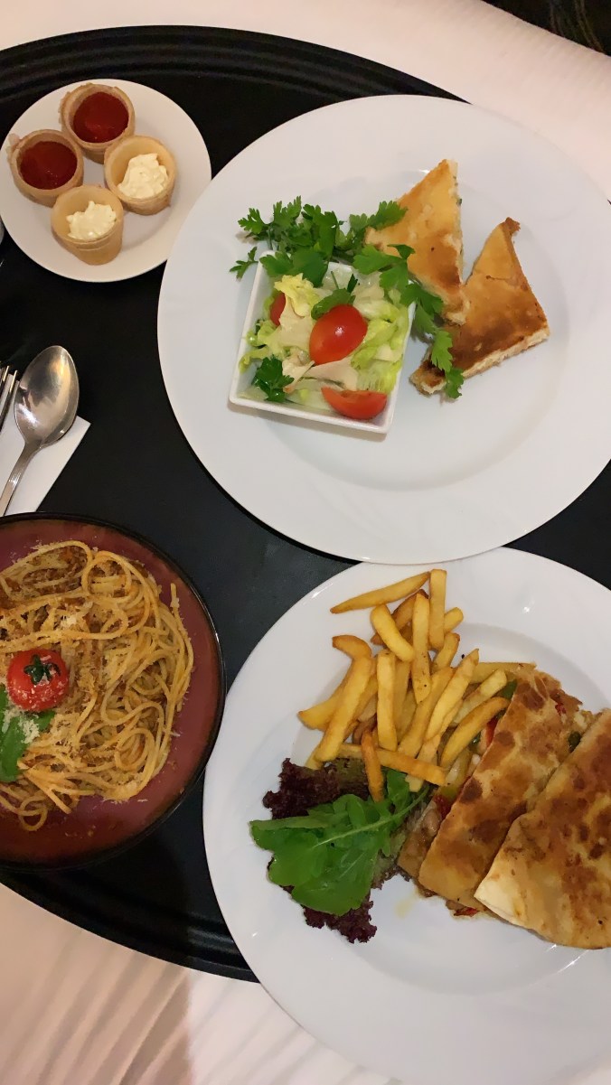 We were really hungry but we didn’t want to go outside to buy food because it was raining so we decided to order room service. It was divine. We order a chicken quesadilla, an Indian sandwich and spaghetti bolognese (the pasta was bland, we added mayo, salt and pepper to it to give it flavour).