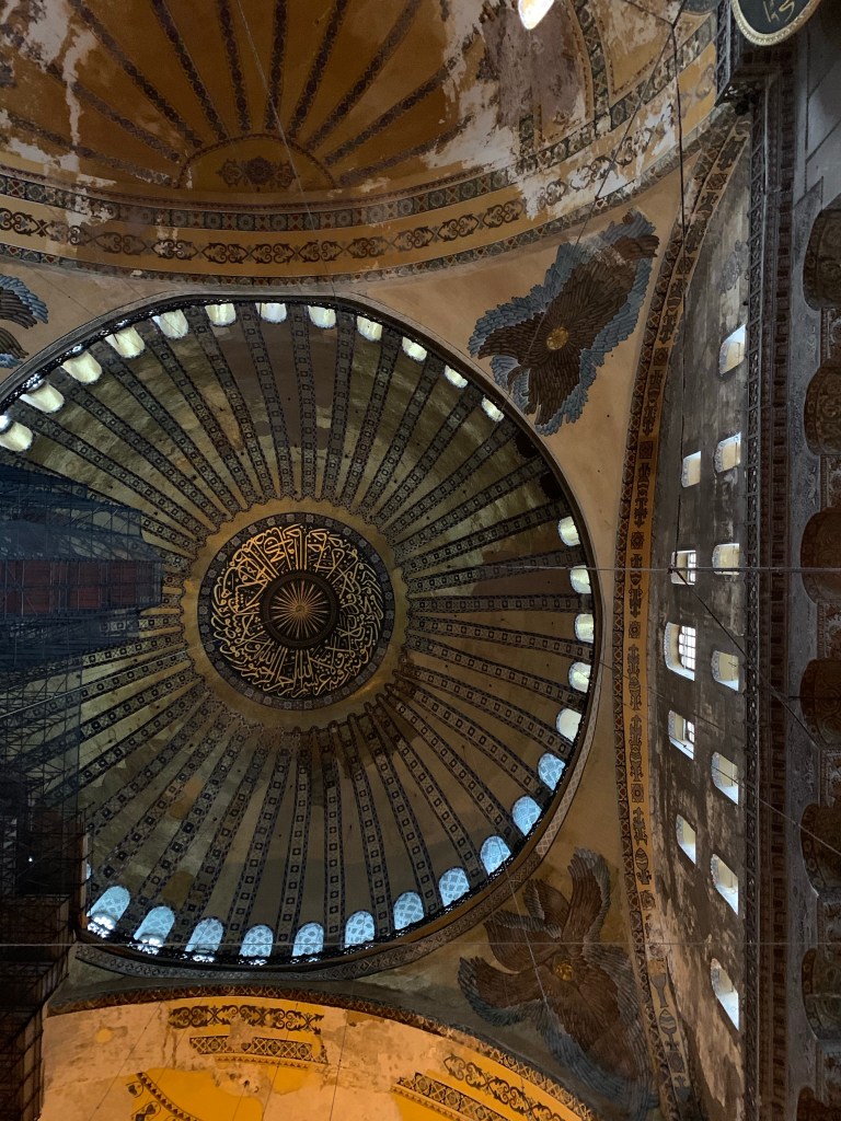 The ceiling and mosaic in Hagia Sophia are from the 10th century. The dolphins on the ceiling represent Poseidon himself. The Hagia Sophia is a mixture of an ancient temple. It was a church and was then converted into a mosque.