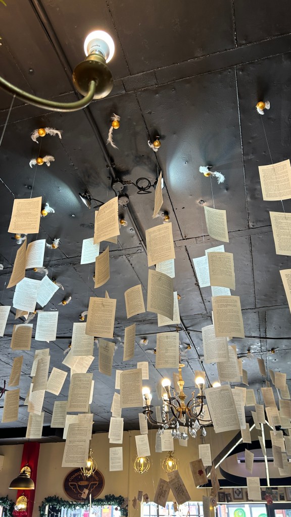 By far the best part of this store is the ceiling. There’s golden snitches and the flying keys from Philosopher’s Stone on the ceiling. It also has pages from the book hanging down and the letters that Harry failed to catch.