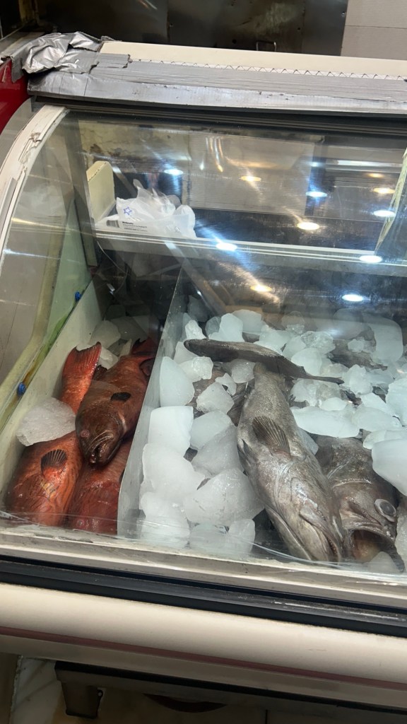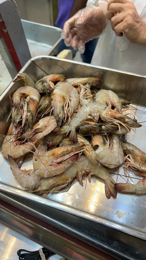 So we got to the restaurant and they have fresh fish on ice. You choose your fish and prawns and then they clean it, marinate it and fry it all in front of you. The fish and prawns come with white or brown rice, chips, salad and sauces.