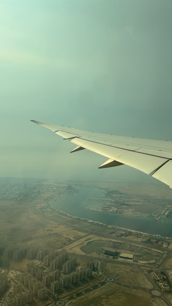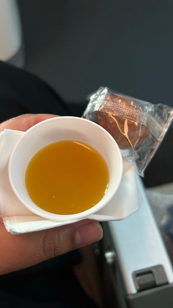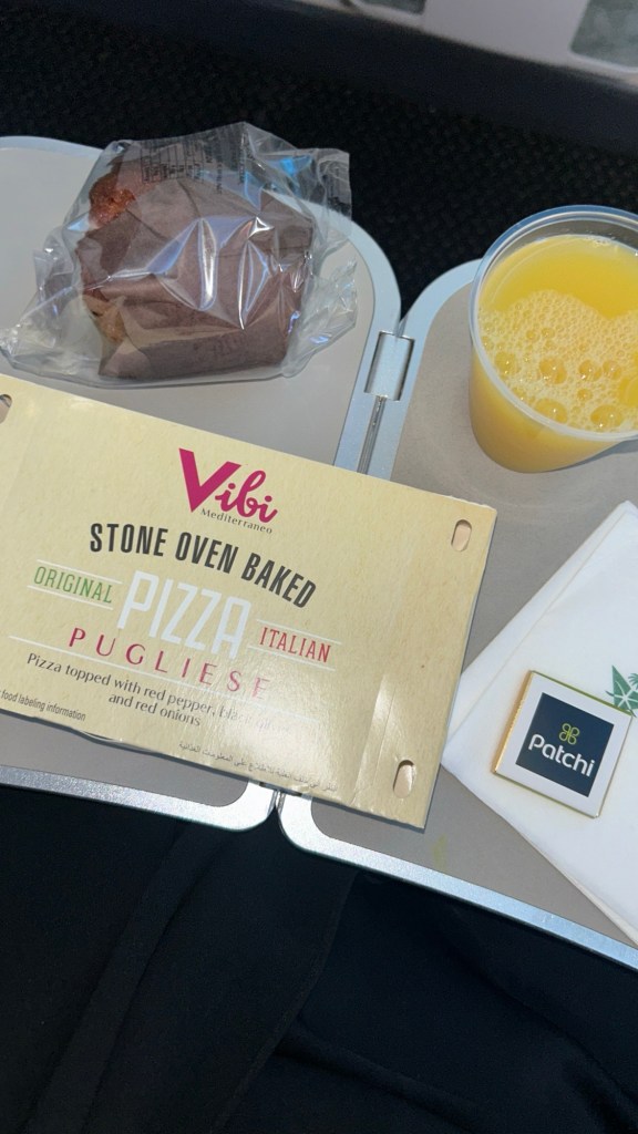 The plan for me was to not sleep since I had work tomorrow but after pulling an all nighter, I took a three hour nap (I’m so thankful that the flight was empty and we all got three seats each again). I woke up to the flight attendant giving stone oven baked pizza which was 10/10. It came with a patchi chocolate (heart eyes!) and a muffin.
