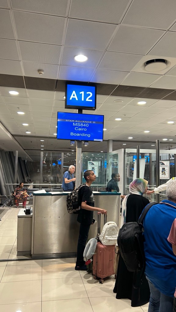 Thankfully, I checked in to our flight the night before, so we ended up in a queue that was slightly shorter. The entire process took about an hour. We checked in our bags, waved goodbye and gave hugs to our family and proceeded to passport control where we proceeded to wait for another half an hour in line.