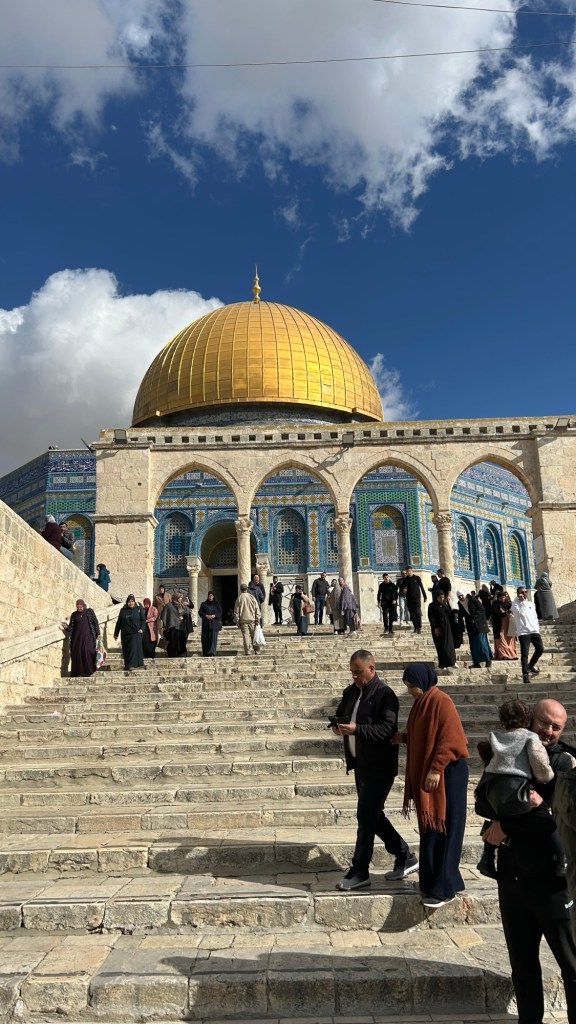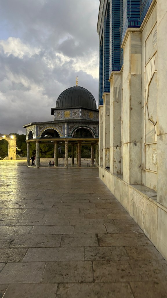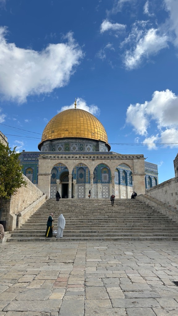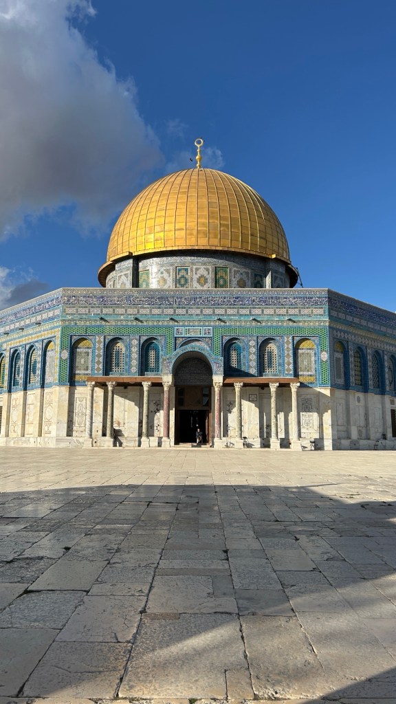 The next stop was my favourite masjid of all. Qubbat as-Sakhra. There are two sun dials in the mosque, if you look at it, you can see the time. You can also still see bullet holes in the exterior of the masjid which are from the shooting of 1990.
