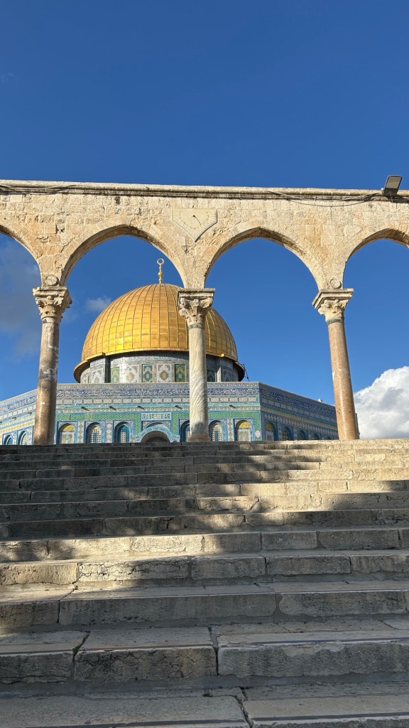 The mosaic on the arch used to be the entire dome of the rock. The gold is real gold. Qubbat as-Sakhra is the oldest Muslim building. It was built by Abdul Malik bin Marwaan in 71 AH. It has been preserved so if you travel through time – it will look the same.