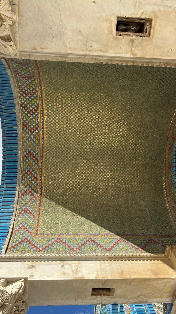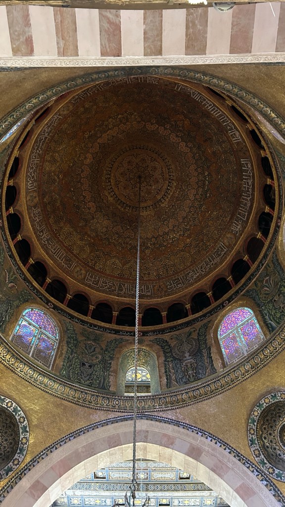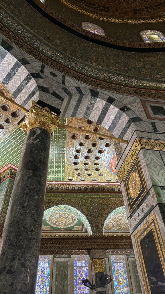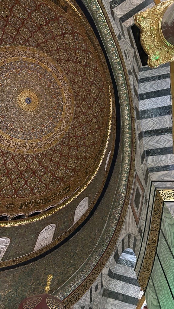 The mosaic on the arches is 1km, it is a mix of different arts which come together to be Islamic art. Initially, the Qur’aan was read without any dots, the dots were added by Abdul Malik bin Marwaan. Shoutout to my little nephew and my bestie, Mohammed Taha because Surah Taha is written on the inside of the Qubbat as-Sakhra.