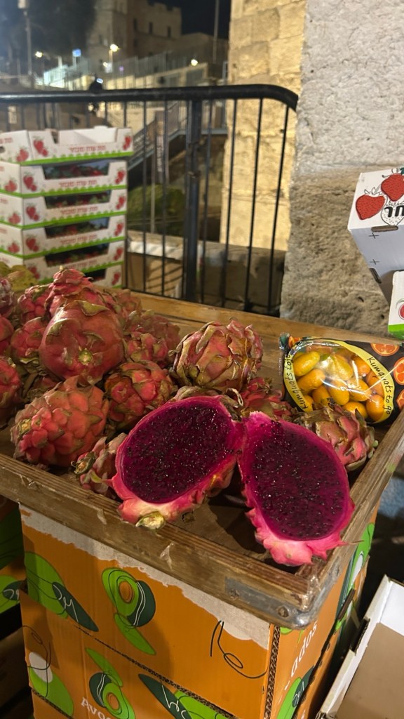 He then pointed out the best places to buy kunafe and hummus and then directed us to outside Damascus gate for the best schwarmas. We also found a fruit vendor selling some dragonfruit.