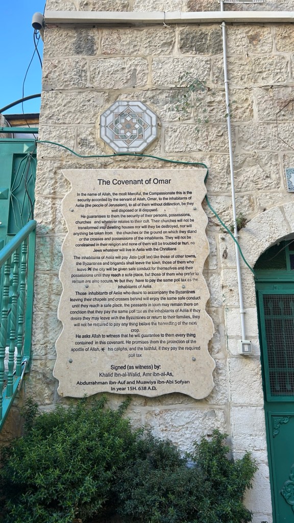 When Sayyidina Umar R.A. conquered Jerusalem, the priest of the church offered him to pray two rakaah of salaah in the church but Sayyidina Umar R.A. declined saying that if he does, the Muslims will want to use this place as a masjid and this place is not for Muslims but for Christians. To avoid any issues, Sayyidina Umar R.A. took a stone and threw it 20m from where he was standing and then prayed salaah where it landed. Salahuddin Ayyobi built the masjid of Sayyidina Umar R.A. in the spot where Sayyidina Umar R.A. prayed that salaah.
