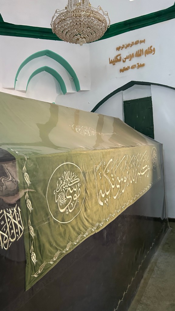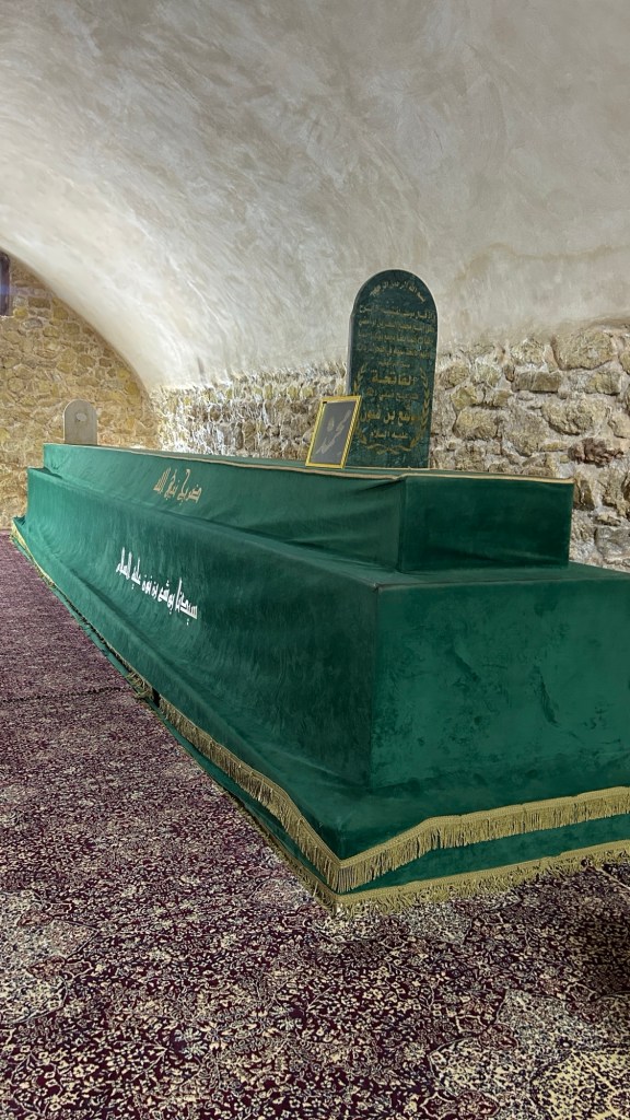 We reached the grave of Nabi Yusha A.S. around Maghrib. Nabi Yusha A.S. was the great grandson of Nabi Yusuf A.S. with his full name being Yusha bin Nun bin Afraeem bin Yusuf. He accompanied Nabi Moosa A.S. when Nabi Moosa A.S. travelled with Khidr A.S. After the Bani Israeel fled Egypt and wandered the desert for 40 years and Nabi Moosa A.S. passed away close to Masjid-ul-Aqsa, Nabi Yusha A.S. took over and led the Bani Israeel over the River Jordan and into the surroundings of Jericho. It is said that when they were about to take the city of Jerusalem it was on a Friday at Asr time. The sunset was close approaching which would mean that it would go into sabbath (Saturday), therefore they would have had to cease fighting. Nabi Yusha A.S. addressed the sun that it was under a command while he was under another command and he prayed to Allah, “O Allah, hold it back from setting!” It was stopped until Allah made him victorious. A hadith has been narrated from Sayyidina Abu Hurairah R.A. that Nabi ﷺ said, “Surely, the sun has never been stopped from setting down for a human being except for on the evening that he conquered the Bayt al-Maqdis.” Nabi Yusha A.S.’s grave is about 9m long, not because he was so tall but because they are not sure of the exact spot.