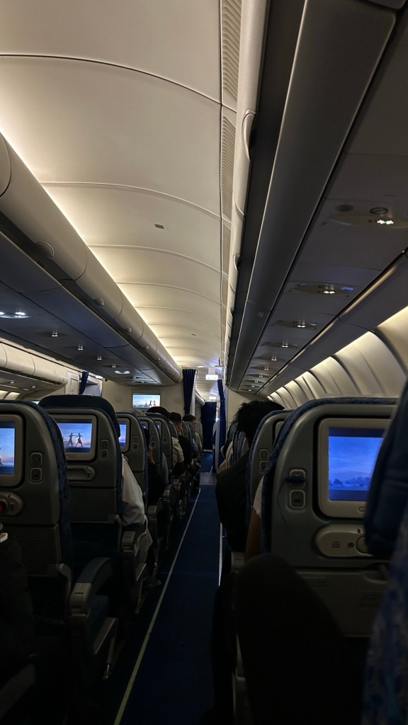 We boarded the plane but once again, we were delayed. At least, this time, we were delayed by only half an hour. They gave us some dinner which consisted of chicken and rice, potato salad, a slice of cake, a bottle of water and a cup of coffee. I’d rate it a 2/10 where the 2 points are for the water and coffee.