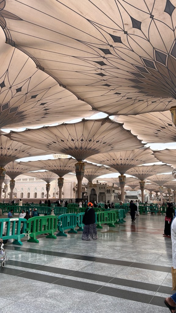 About an hour later, we walked to the haram. It felt so so so surreal to be here. The umbrellas were open. The fans were blowing water. The people were walking everywhere. We were in Madinah. The city of peace. The city of our prophet ﷺ.