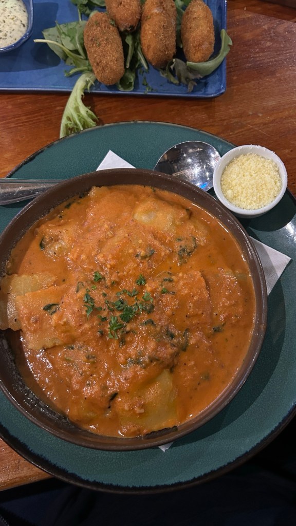 We went straight for supper to the Butcher’s Wife which was about 30 minutes away. We had the jalapeño poppers, fried brinjal and pizza rolls for starters which were very lekker. I ordered ravioli which was a bit mid so I ended up tasting from everyone. My aunty’s steak salad was the winner for me though – the flavours came together so nicely. The Alfredo pasta was also nice and the steak baguette.